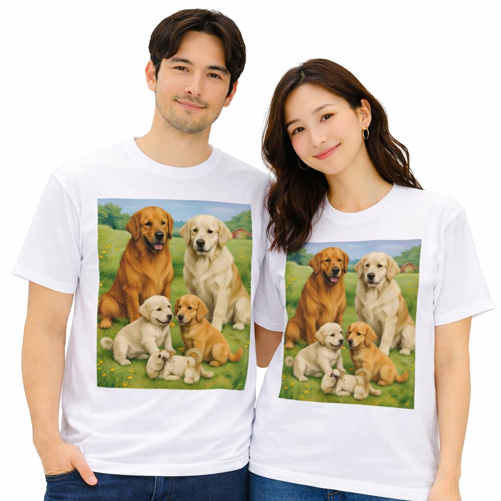 親子のゴールデンレトリバーが描かれた、癒し度満点のプリントTシャツ。